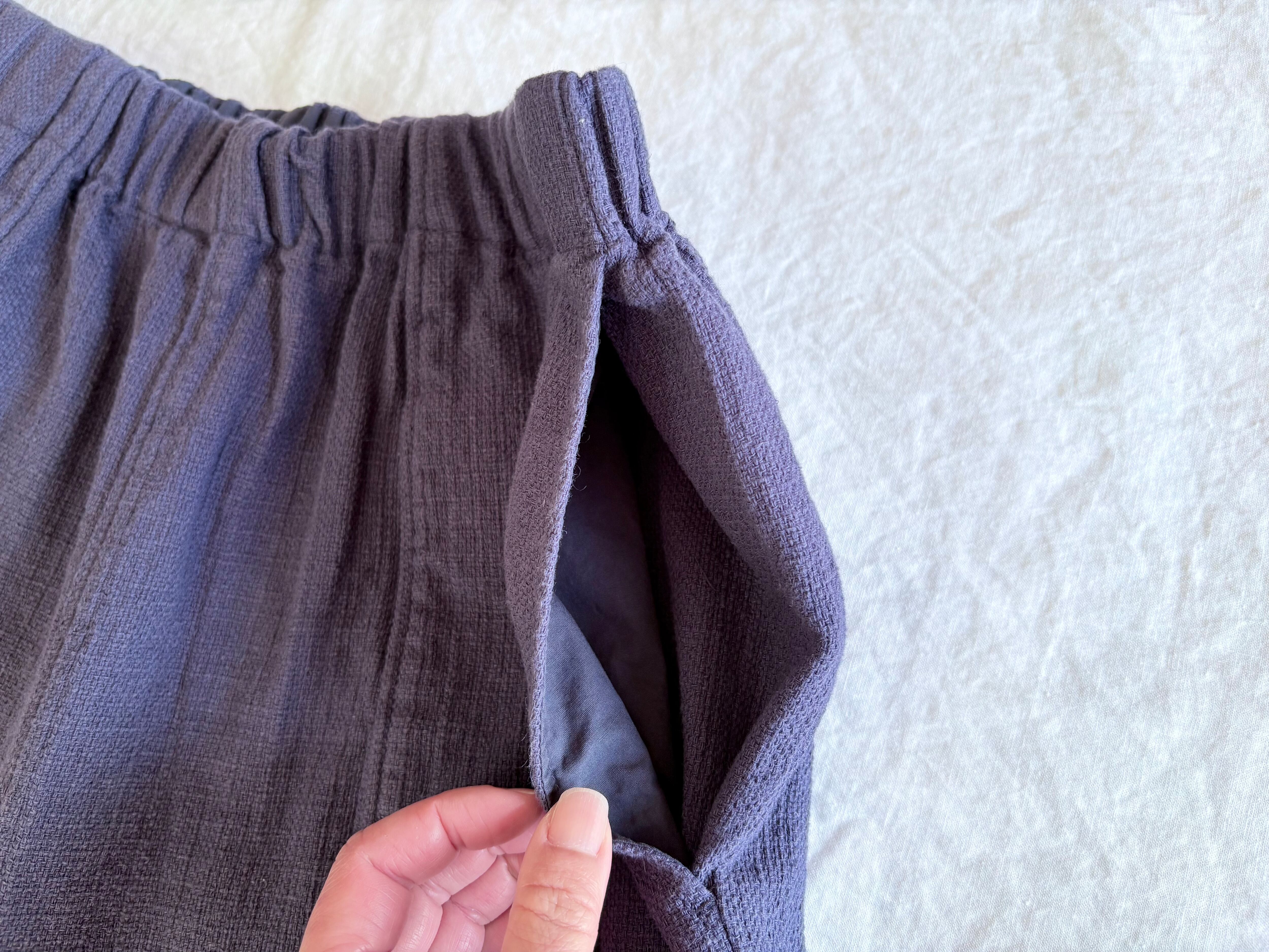 ウエストはぐるりとゴム仕様で、内側には調整可能な紐付き。